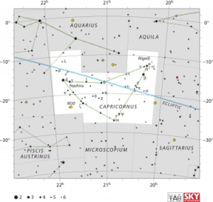 Several galaxies and star clusters are contained within Capricornus.Messier 30 is a globular cluster located 1 degree south of the galaxy group NGC 7103. The constellation also harbors the wide spiral galaxy NGC 6907.Capricorn is a faint constellation, with only one star above magnitude 3; its alpha star has a magnitude of only 3.6.[1]