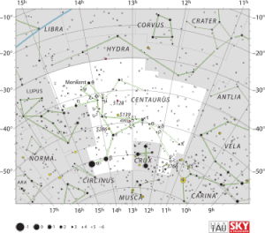 Centaurus contains several very bright stars because of its position in theMilky Way; in addition, its alpha and beta stars are used to find the constellation Crux. The constellation has 281 stars above magnitude 6.5, meaning that they are visible to the unaided eye, the most of any constellation. Alpha Centauri, the closest star to the Sun, has a high proper motion; it will be a mere half-degree from Beta Centauri in approximately 4000 years. Alpha Centauri is a triple star system that contains Proxima Centauri, the nearest star to the Sun. In addition to Alpha Centauri (the 3rd brightest star in the sky), a second first magnitude star, Beta Centauri, is part of Centaurus. Also called Hadar and Agena, Beta Centauri is a double star; the primary is a blue-hued giant star of magnitude 0.6, 525 light-years from Earth.ω Centauri (NGC 5139), despite being listed as the constellation's "omega" star, is in fact a naked-eye globular cluster, located at a distance of 17,000 light-years with a diameter of 150 light-years. It is the largest and brightest globular cluster in the Milky Way, at ten times the size of the next-largest cluster.[1]