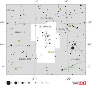 Delphinus is a constellation in the northern sky, close to the celestial equator. Its name is Latin for dolphin. Delphinus was one of the 48 constellations listed by the 2nd century astronomer Ptolemy, and it remains among the 88 modern constellations recognized by the International Astronomical Union. It is one of the smaller constellations, ranked 69th in size. Delphinus' brightest stars form a distinctive asterism that can easily be recognized. It is bordered (clockwise from north) by Vulpecula the fox, Sagitta the arrow, Aquila the eagle, Aquarius the water-carrier, Equuleus the foal and Pegasus (Constellation) the flying horse.[1]
