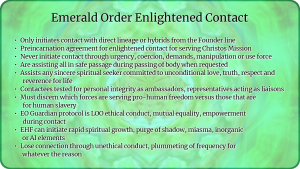 Emerald Order Guardians will initiate enlightened contact with loving kindness, respect and honoring personal sovereignty, in which they will expect the same reciprocal expression in return. Guardians will require that you as a human being are willing to be self-responsible and put in the personal effort in your own learning, growth and personal healing. It is suggested to work with the 12D Christos shielding process, GSF boundary testing and Unity Vow in the morning and before bedtime, which helps to attune your energy field to the Guardian Christos frequency. When enlightened contact is happening, it can be very subtle in order to test out field occurrences and your specific reactions to such energetic contact.