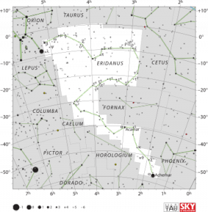 At its southern end is the magnitude 0.5 star Achernar, designated Alpha Eridani. 144 light-years from Earth, it is a blue-white hued main sequence star whose traditional name means "the river's end".Achernar is a very peculiar star because it is one of the flattest stars known.