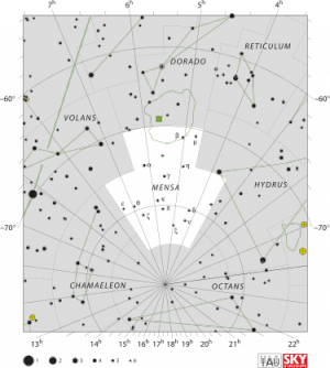 Mensa is a constellation in the southern sky, created in the 18th century. Its name is Latin for table. It covers a keystone-shaped wedge of sky stretching from approximately 4h to 7.5h of right ascension, and −71 to −85.5 degrees of declination. Other than the south polar constellation of Octans, it is the most southerly of constellations. As a result, it is essentially unobservable from the Northern Hemisphere. Besides those already mentioned, its other neighbouring constellations are Chamaeleon, Dorado, Hydrus, and Volans. It is the only constellation named after a feature on Earth. [1]