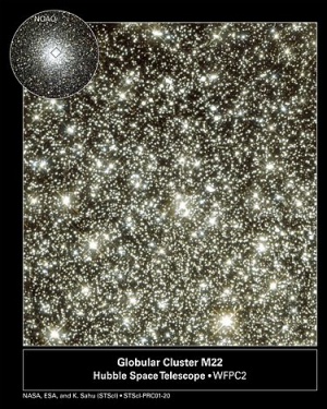 It was one of the first globular clusters to be carefully studied first by Harlow Shapley in 1930. He discovered roughly 70,000 stars and found it had a dense core. M22 is one of the nearer globular clusters to Earth at a distance of about 10,600 light-years away. It spans 32' on the sky which translates to a spatial diameter of 99 ± 9 light-years. 32 variable stars have been recorded in M22. It is projected in front of the galactic bulge and is therefore useful for its microlensing effect on the background stars in the bulge.Two black holes of between 10 and 20 solar masses each have been discovered, initially with the Very Large Array radio telescope in New Mexico, and corroborated by the Chandra X-ray telescope, in 2012. Their detection implies that gravitational ejection of black holes from clusters is not as efficient as was previously thought, and leads to estimates of a total 5 to 100 black holes within M22.[1]