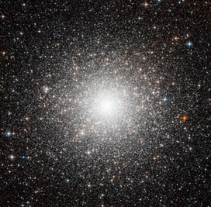 Messier 54 (also known as M54 or NGC 6715) is a globular cluster in the constellation Sagittarius. It was discovered by Charles Messier in 1778 and subsequently included in his catalog of comet-like objects. Previously thought to belong to our Galaxy at a distance from Earth of about 50,000 light-years, it was discovered in 1994 that M54 most likely belongs to the Sagittarius Dwarf Elliptical Galaxy (SagDEG), making it the first globular cluster formerly thought to be part of our galaxy reassigned to extragalactic status, even if not recognized as such for nearly two and a quarter centuries. Modern estimates now place M54 at a distance of some 87,000 light-years, translating into a true radius of 150 light-years across. It is one of the denser of the globulars, being of class III (I being densest and XII being the least dense). It shines with the luminosity of roughly 850,000 times that of the Sun and has an absolute magnitude of −10.0. As it is located on SagDEG's center, some authors think it actually may be its core;[8] however others have proposed that it is a real globular cluster that fell to the center of this galaxy due to decay of its orbit caused bydynamical friction. M54 is easily found in the sky, being close to the star ζ Sagittarii. It is, however, not resolvable into individual stars even with larger amateur telescopes. In July 2009, a team of astronomers reported that they had found evidence of an intermediate-mass black hole in the core of M54.[1]