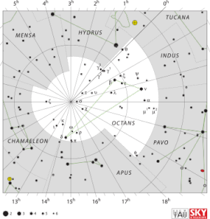 Octans is a faint constellation located in the deep southern sky. Its name is Latin for the eighth part of a circle, but it is named after the octant, a navigational instrument. The constellation was devised by French astronomer Nicolas Louis de Lacaille in 1752, and it remains one of the 88 modern constellations. Octans is bordered by seven different constellations, most of which are far more prominent than itself: Apus (the bird-of-paradise), Mensa (the table), Chamaeleon (the chamaeleon), Pavo (the peacock), Indus (the Indian), Tucana (the toucan), and Hydrus (the male water snake). Octans is a very faint constellation; its brightest member is Nu Octantis, a spectral class K1 III giant star with an apparent magnitude of 3.73.