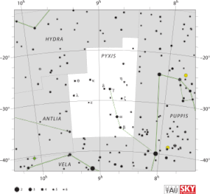 Pyxis is a small and faint constellation in the southern sky. Its name is Latin for a mariner's compass (it should not be confused with Circinus, which represents a draftsman's compasses). Pyxis is completely visible from latitudes south of 53 degrees north, with its best evening-sky visibility in January through March. The brightest star is Alpha Pyxidis at magnitude 3.68.Pyxis was introduced by Nicolas Louis de Lacaille in the 18th century; he called it Pyxis Nautica, but the name was shortened. The constellation is located close to those forming the old constellation of Argo Navis (the ship Argo), and in the 19th century astronomer John Herschel suggested renaming Pyxis to 'Malus, the mast', but the suggestion was not followed.